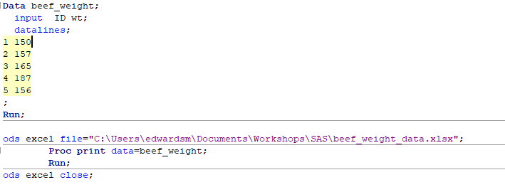 ods excel file=”C:\Users\edwardsm\Documents\Workshops\SAS\beef_weight_data.xlsx”;