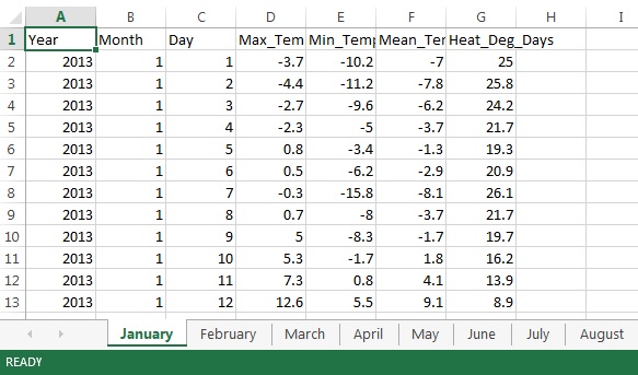 Let’s start with an Excel spreadsheet with temperature data for the months of January through to August, with each month on a separate worksheet.